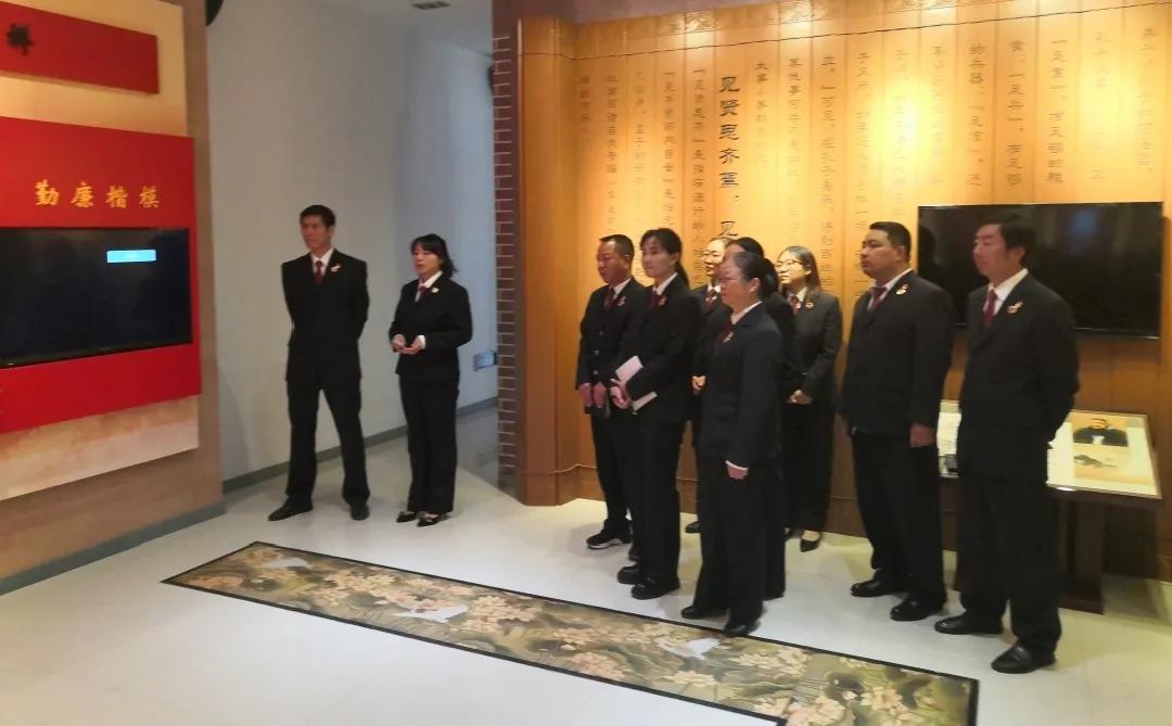 在本院讲解人员的带领下,干警们首先参观了一楼的廉政教育厅。地板上镶嵌着一条由清水、白鹭、莲花三个意象组合而成的地贴,它们象征着廉洁,走在上面可以踏莲、悟廉。