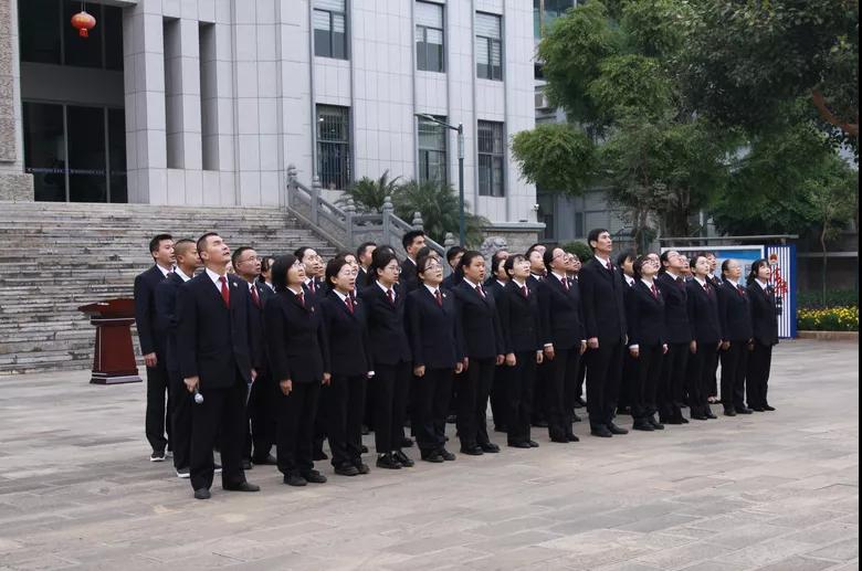 仪式现场,气氛庄严肃穆,五星红旗在激昂的《义勇军进行曲》中冉冉升起。干警们全体肃立奏唱国歌,并向国旗行注目礼。