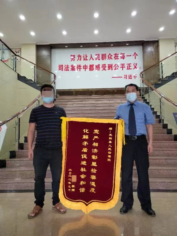 2022年5月16日上午,被元阳县人民检察院决定相对不起诉的张某来到该院,将一面写有“宽严相济彰显检察温度,化解矛盾促进社会和谐”的锦旗送到承办检察官手中,借此表达对元阳检察院依法人性化办案的感激之情。