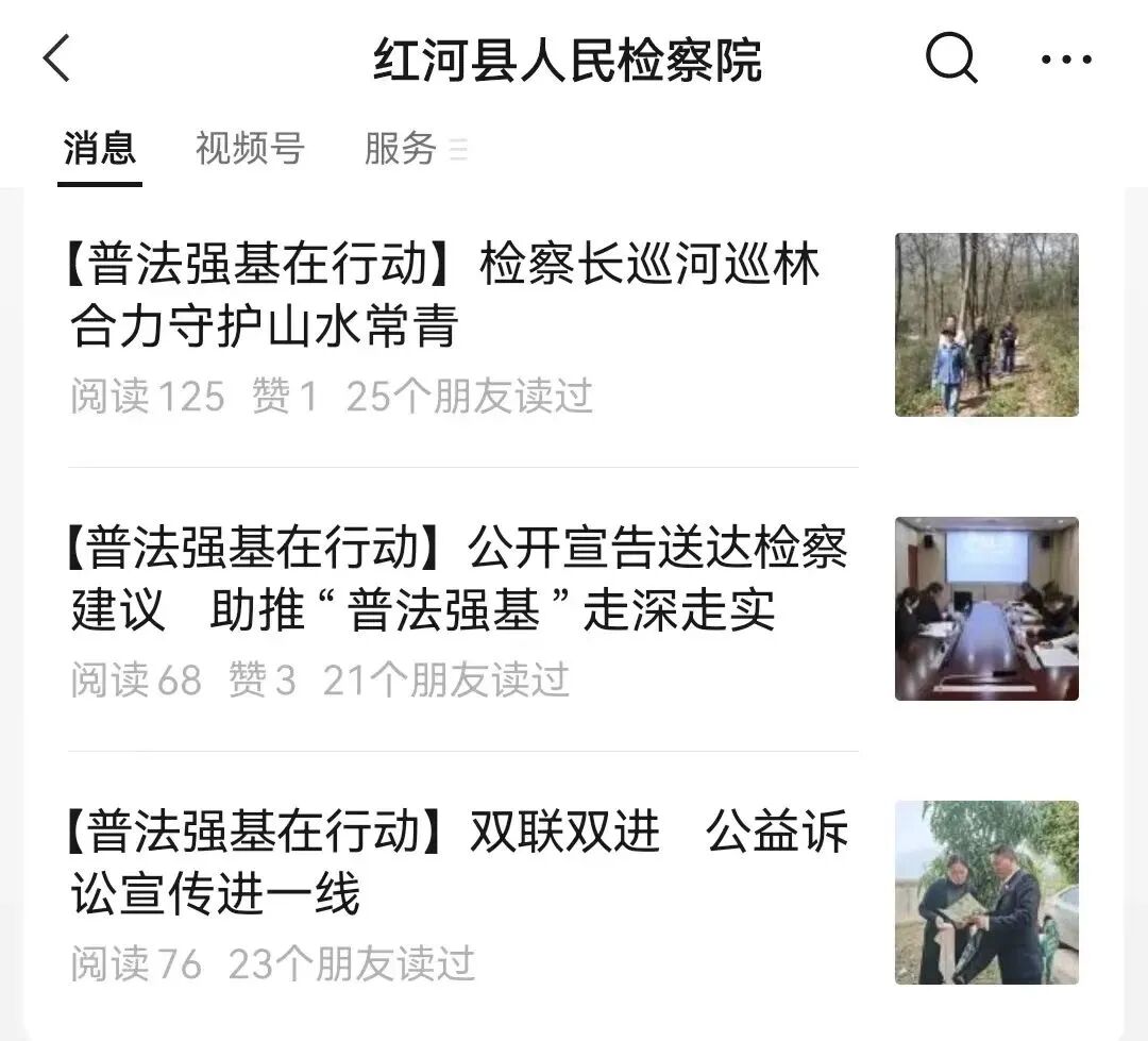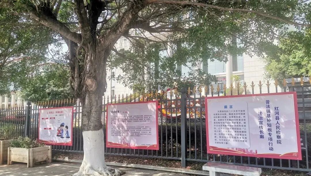 不断拓宽普法宣传形式,建强宣传阵地,部门工作特点,建设红河县人民检察院法治宣传长廊,发布典型案例,依托“12309”检察服务中心打造普法窗口,提供案件案件受理、信息查询、法律咨询等高效便捷的一站式服务。发挥门户网站、微信公众号、微博、抖音等新媒体平台作用,开辟普法强基专题专栏、进行网上知识竞答、发布普法读物等方式不断推动普法广度。