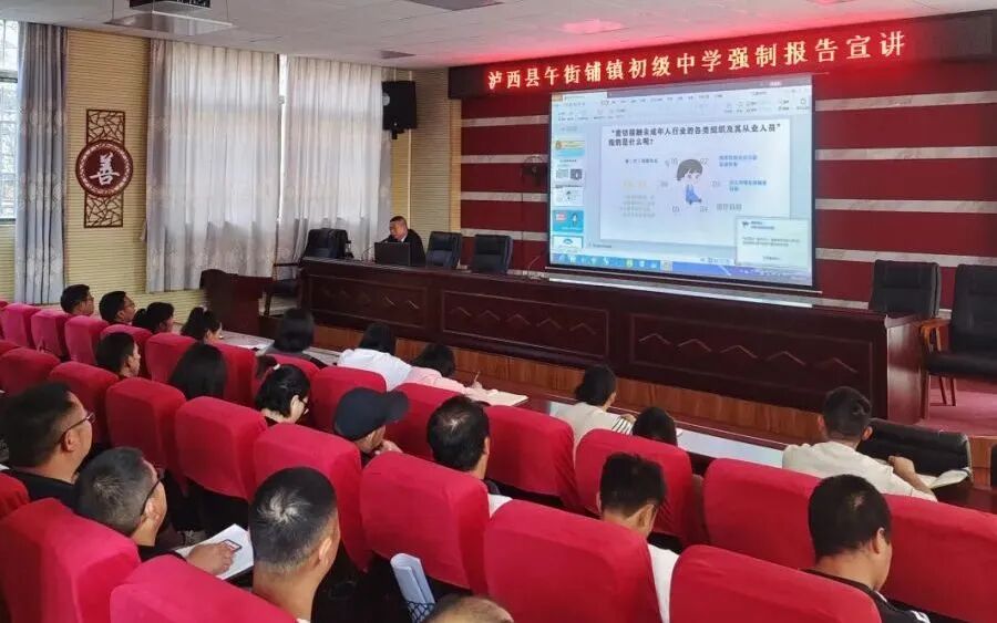泸西县人民检察院党组成员、副检察长赵刚到午街铺镇初级中学,以“落实强制报告制度——撑起未成年人的‘保护伞’”为主题,为全体教师讲解强制报告制度。